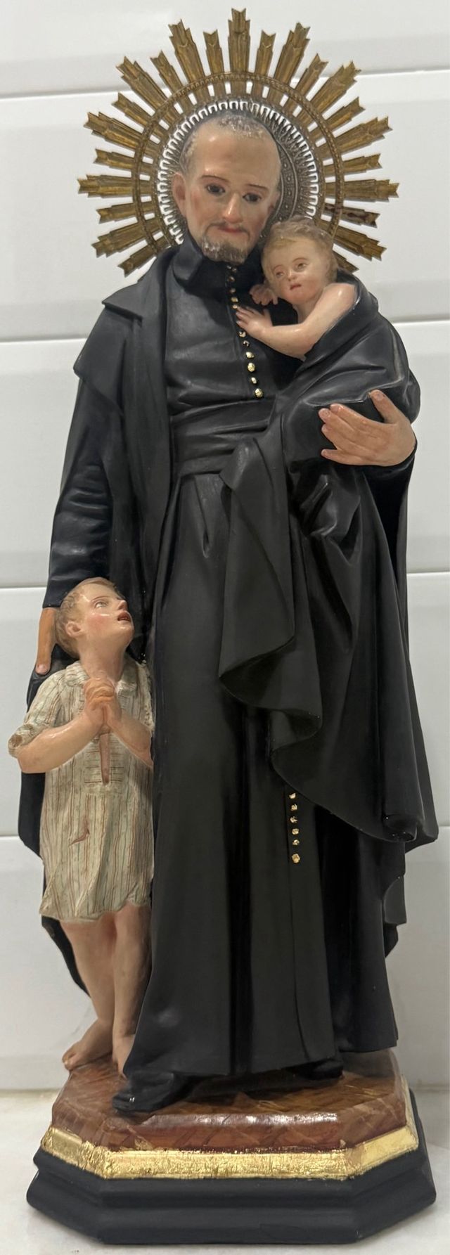 Detalles del productoAntigua y espectacular figura religiosa de gran tamaño de origen español de finales del siglo XIX principios del siglo XX de la prestigiosa casa de Olot representando a San Vicente de Paul realizada en pasta de madera policromada y pan de oro sobre base de madera y ojos de cristal. Elegantes detalles y halo realizado en latón dorado y plateado. En excelentes condiciones de conservación para su antigüedad. Una verdadera joya de colección. Medidas: 54 cms de alto, 22 cms de largo y 17 cms de ancho.