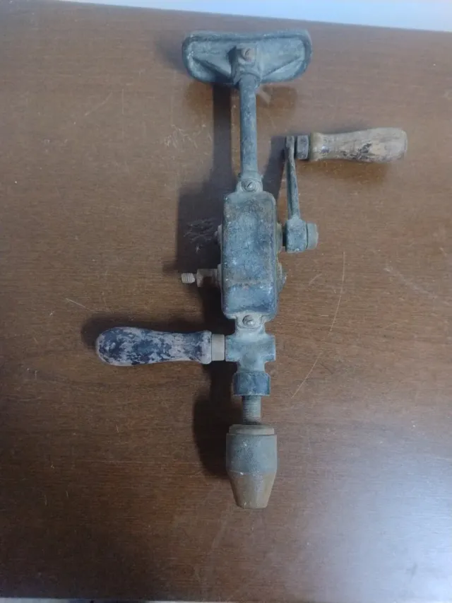 Herramienta manual antigua para taladrar. - Mango de madera. - Cuerpo metálico.