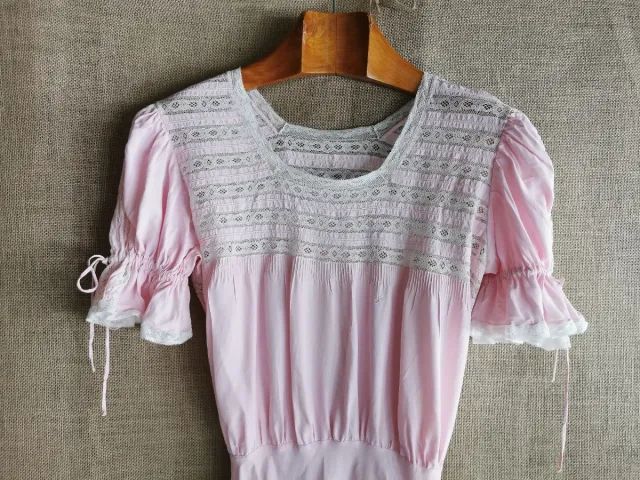 Antiguo Vestido rosa en rayón y encaje romántico