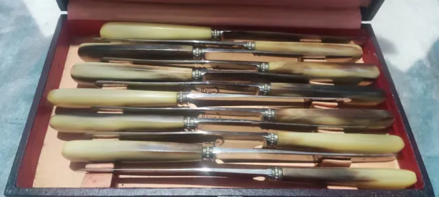 Conjunto de 12 cuchillos antiguos con mangos de cuerno, en estuche y con cuño Au gaulois