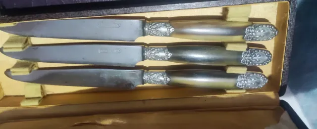 Conjunto de cuchillos antiguos presentados en su estuche. - Mangos de cuerno con detalles ornamentales. - Hojas de metal con inscripcion Chatellerault - Estuche