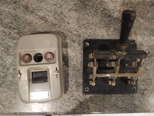 b) dispositivo antiguo interruptor guillotina marca TEM de 20 amperios con base aislante de pizarra. (ambos objetos en desuso apreciados por coleccionistas).