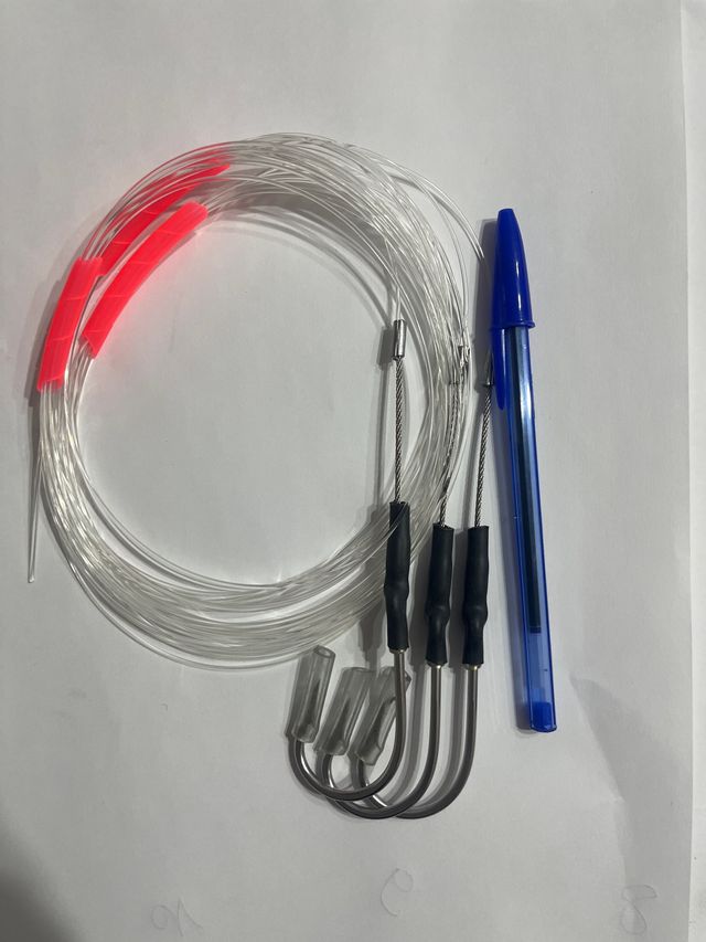 Set de anzuelos de pesca listos para usar. - Incluye sedal transparente. - Varios anzuelos con protectores. - Detalle de flotadores naranjas.