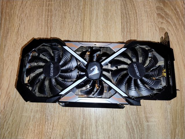Detalles del productoTarjeta gráfica Aorus GTX 1080 Ti con un diseño potente y llamativo.