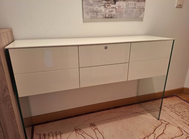 Detalles del productoAparador de diseño lacado en blanco con laterales de cristal. Con dos cajones centrales y los laterales tienen una balda de cristal en el interior. Medidas 120x34x79. Muy buen estado, tan solo tiene un toque en una de la esquinas y un pequeño golpe en la zona delantera (ver dos últimas fotos). Costó 1400€. A recoger en Santander, zona Peñacastillo. No se hacen envíos. Medidas del producto