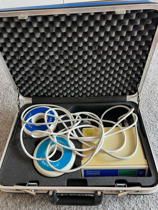 Se vende un aparato de magnetoterapia en excelente estado. Es ideal para terapias de rehabilitación y alivio de dolores articulares y musculares. Incluye la unidad principal con pantalla digital, dos solenoides (anillos de tratamiento) y el cable de conexión. Todo se guarda en un práctico maletín de transporte, como se muestra en las fotos.