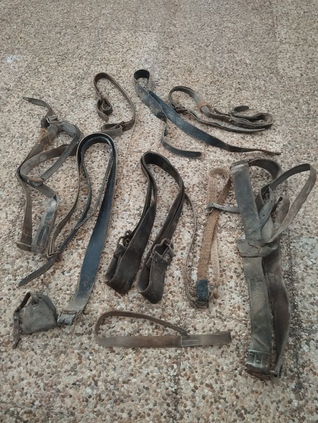 Detalles del productoConjunto de correajes y cinchas antiguas de cuero. Ideales para decoración o coleccionismo.