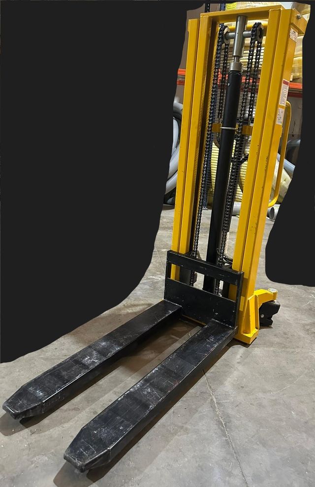 Apilador hidráulico marca Ayerbe con capacidad de carga de 1500 kg. - Color amarillo. - Horquillas negras.