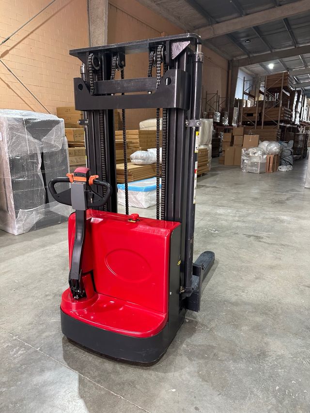Apiladora eléctrica en color rojo y negro, ideal para almacenes y logística. - Diseño robusto y funcional.