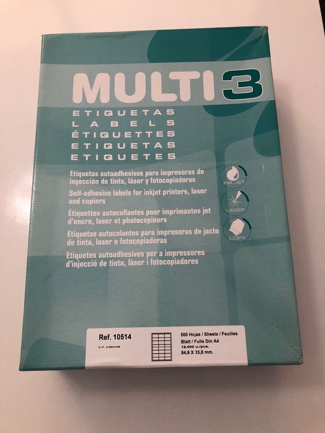 Detalles del productoEtiquetas adhesivas MULTI3, perfectas para impresora de inyección de tinta, láser y fotocopiadora. Son 500 hojas tamaño A4. - Formato: A4. - Cantidad: 480 hojas. - Compatibles con impresoras de inyección de tinta, láser y fotocopiadoras. - Medidas: 64,6 x 33,8 mm. -11.520 etiquetas. La caja está en perfecto estado.