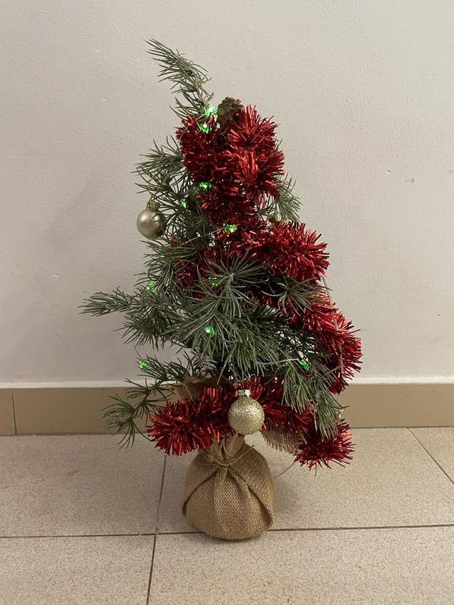 Árbol de Navidad pequeño con decoraciones incluidas (bolas, guirnalda y luces). Mide 50cm.
