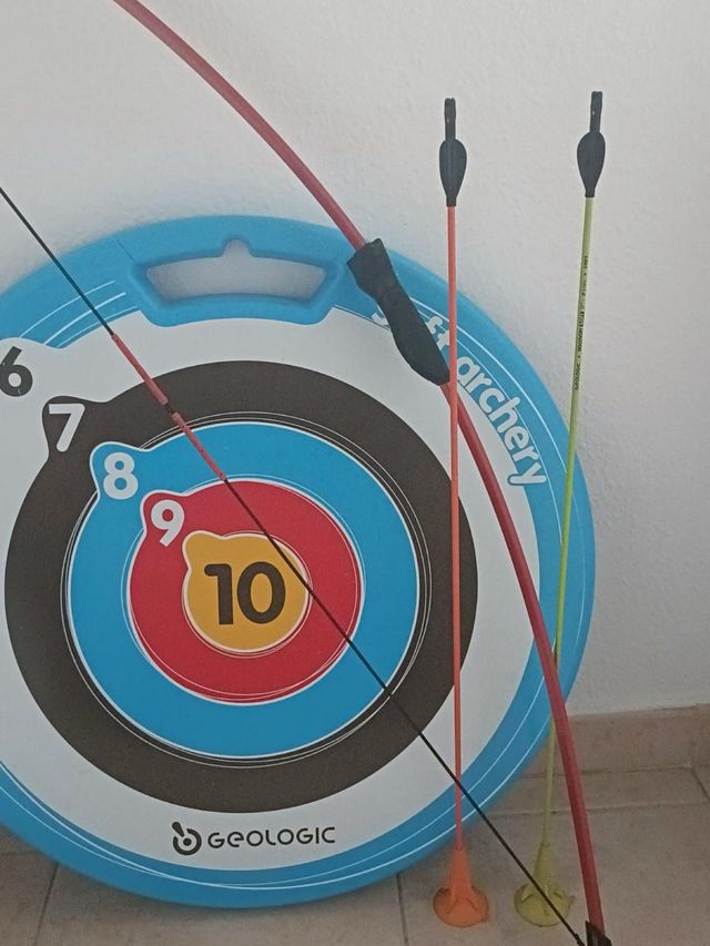 Set de tiro con arco de la marca Geologic. - Diana con números y colores. - Arco rojo. - Dos flechas con puntas negras.