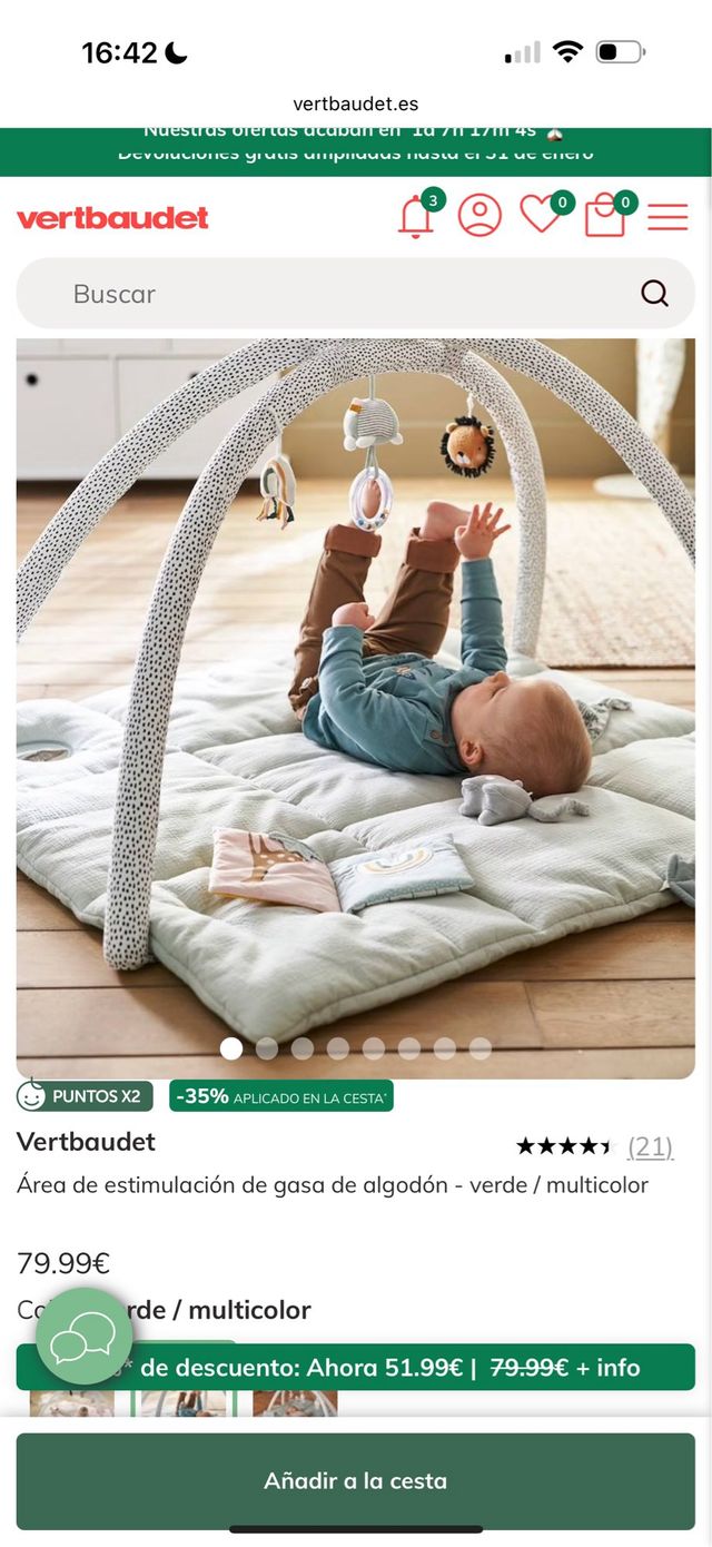 Detalles del productoÁrea de estimulación de gasa de algodón para bebé, en tonos verde y multicolor. Ideal para el desarrollo y entretenimiento del bebé.