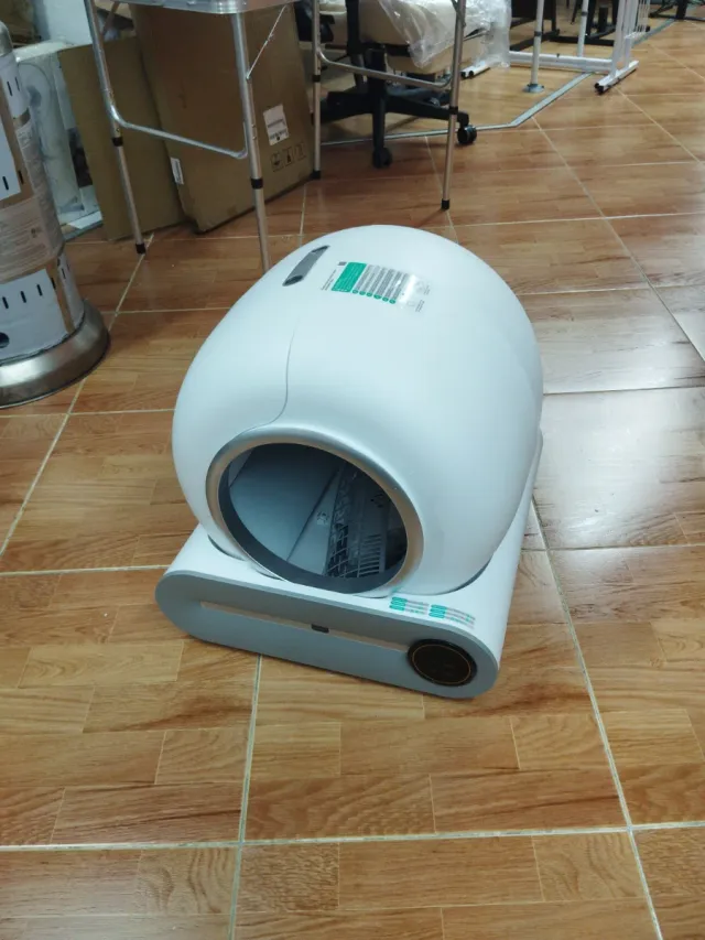 Arenero automático para gatos con un diseño moderno y ovalado. - Color blanco y base gris. - Entrada circular. - Panel de control en la base.