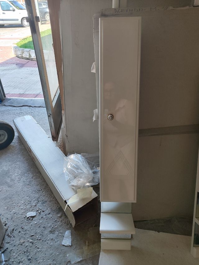 Armario de baño lacado en blanco, de medidas 18*101*15 cm. Se encuentra en buen estado. Tiene un poco de defecto en el cristal por ello el precio