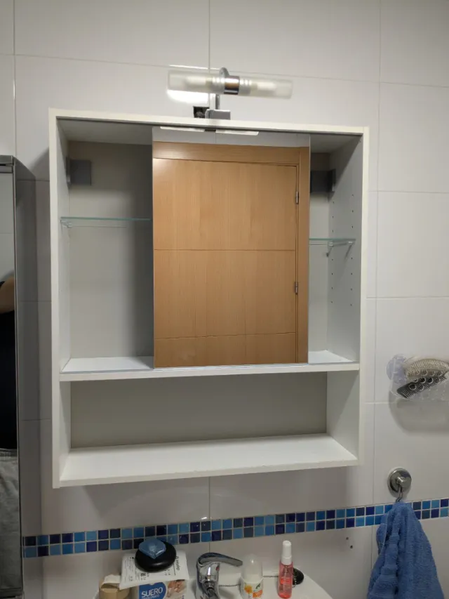 Armario de baño con espejo deslizante que da acceso a las dos zonas. Dos estantes de cristal, con multiples posibles posiciones. Un práctico mueble para organizar tus artículos de aseo. Integra aplique con dos bombillas led reemplazables.