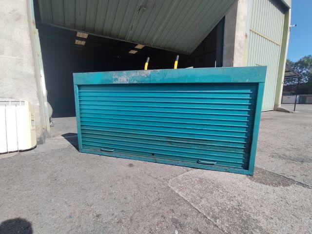 Detalles del productoArmario de herramientas de color azul con puerta enrollable.