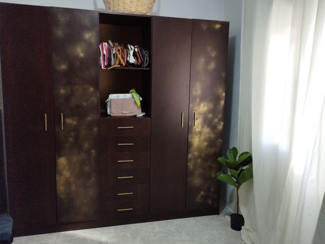 Detalles del productocasi nuevo las medidas son las puestas 2,10 alto*2,09 ancho *52 cm fondo. Es marrón oscuro. Fácil de desmontar. Es muy espacioso