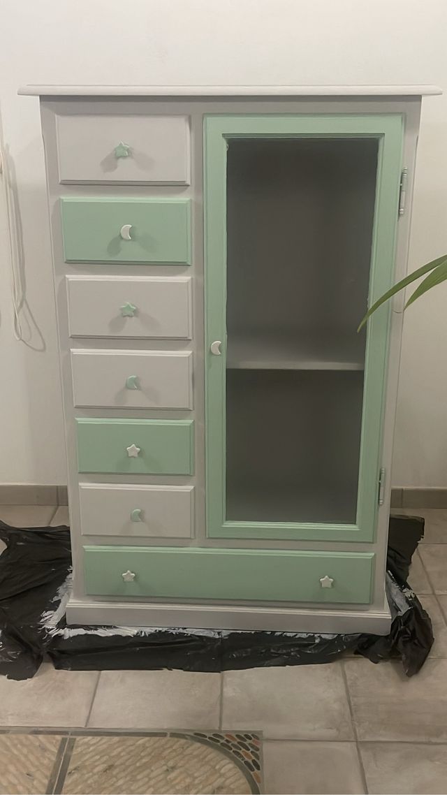 Armario infantil de madera, tiene cajonera y puerta de cristal con balda. Pintado en gris y verde agua