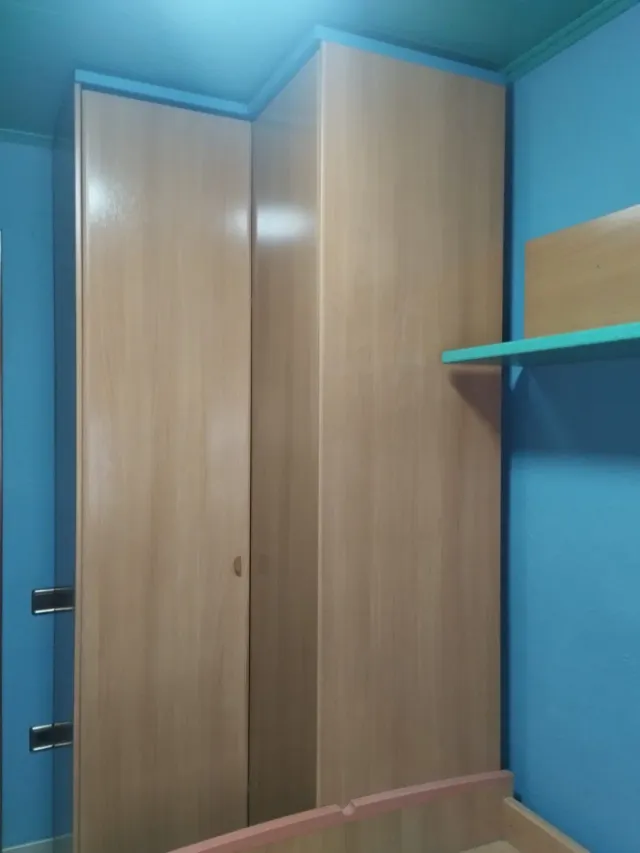 Detalles del productoHabitación completa, armario de esquina,cama con cajones, mesita con rueda y una estantería.