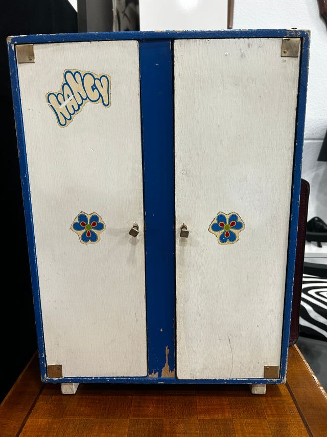 Detalles del productoAuténtico armario de la muñeca Nancy, fabricado por Famosa en los años 80. Pintado en tonos blanco y azul, con flores decorativas y el nombre “Nancy” en la puerta, este mueble es una pieza icónica de la infancia de toda una generación.