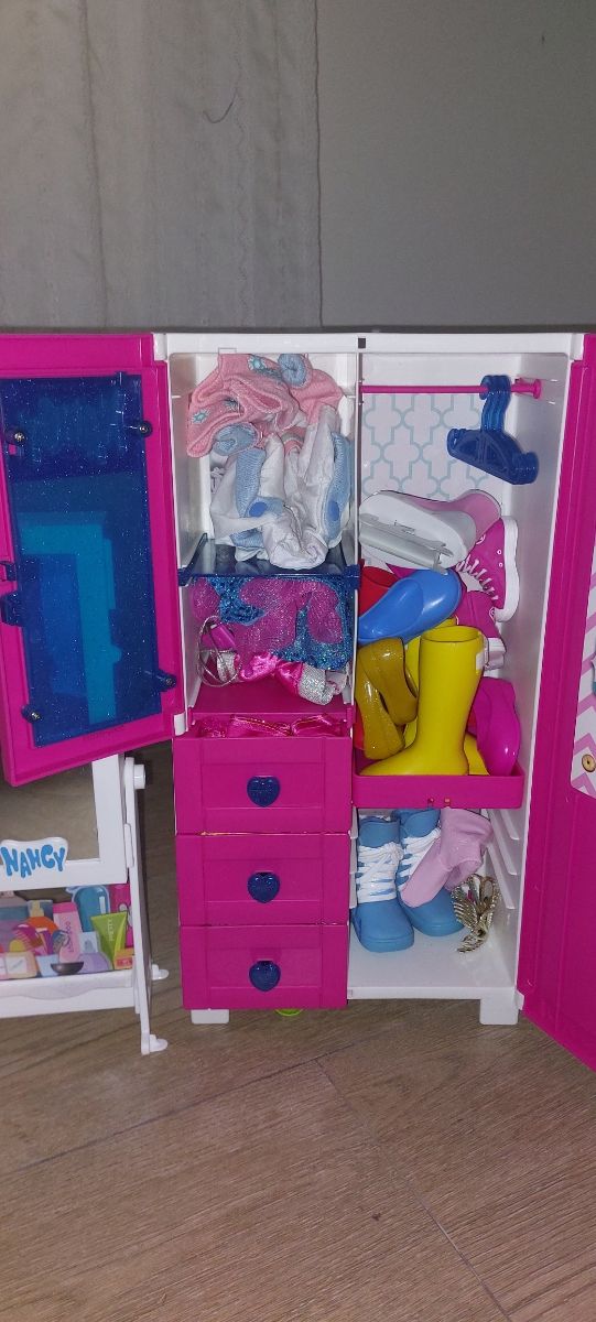 Detalles del productoPreciosa colección de armario y tocador para muñecas Nancy. Incluye un armario rosa con cajones, perchero y espacio para zapatos. Además, se incluye una gran variedad de ropa y zapatos para vestir a la muñeca. Todo en buen estado.