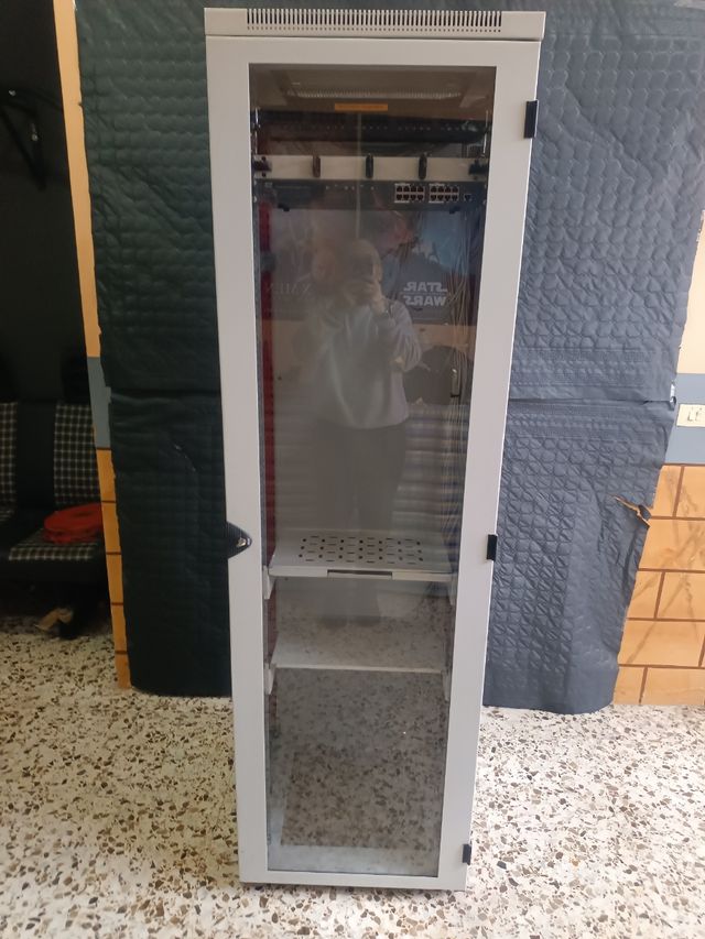 Detalles del productoArmario rack de 19 pulgadas, ideal para servidores u otros equipos de red. Se encuentra en buen estado, con algunas señales de uso.