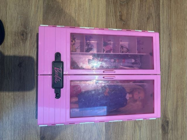Detalles del productoArmario ropero de Barbie con una muñeca y varios vestidos.