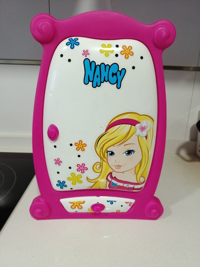 Armario de juguete de la muñeca Nancy. Tiene un diseño divertido con la imagen de Nancy y flores. - Color rosa. - Incluye accesorios decorativos, ropa y zapatos