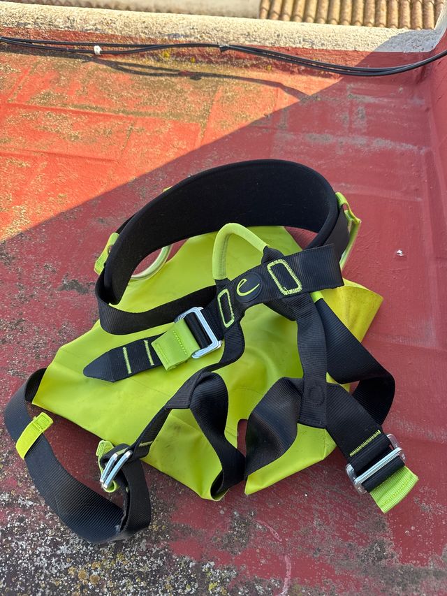 Detalles del productoArnés de barranquismo de color verde lima y negro, diseñado para la seguridad en actividades acuáticas.