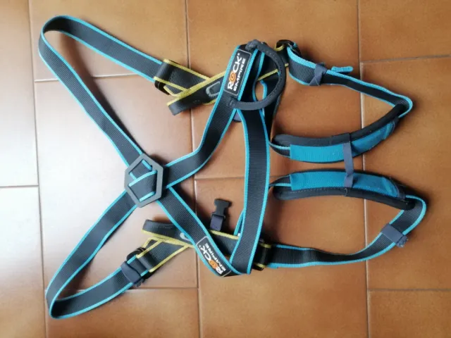 Arnés de escalada diseñado para los más pequeños de la casa. Es cómodo y seguro. - Color gris y azul con detalles en amarillo. - Marca: Rock Empire.
