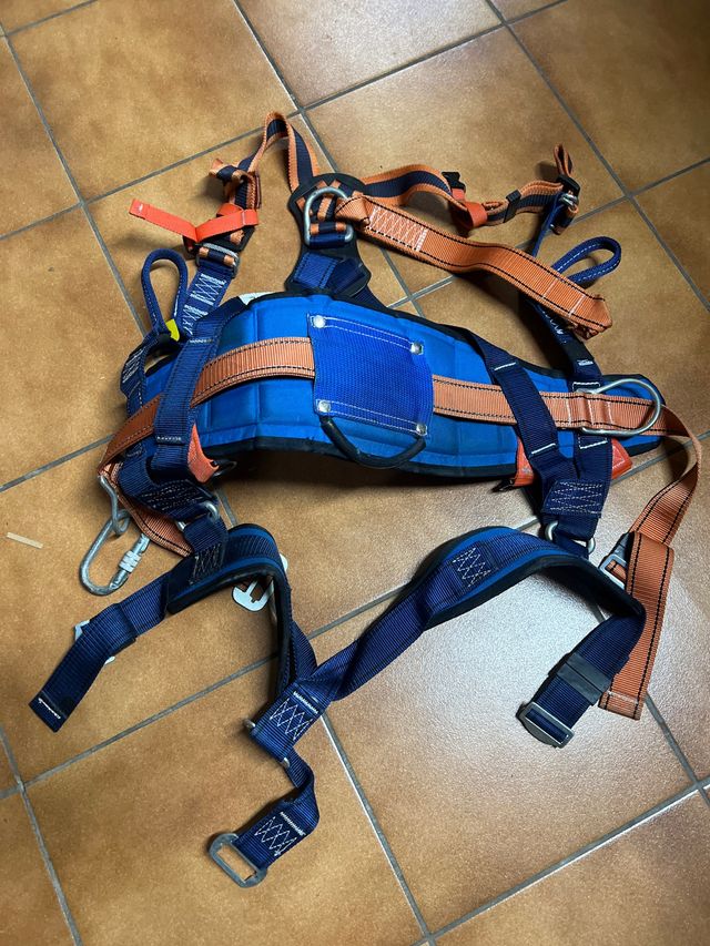 Arnés de confort para trabajo en altura marca Faru, modelo P-61E. Diseñado para ofrecer comodidad y seguridad. - Color azul y naranja. - Hebillas y anillas metálicas.