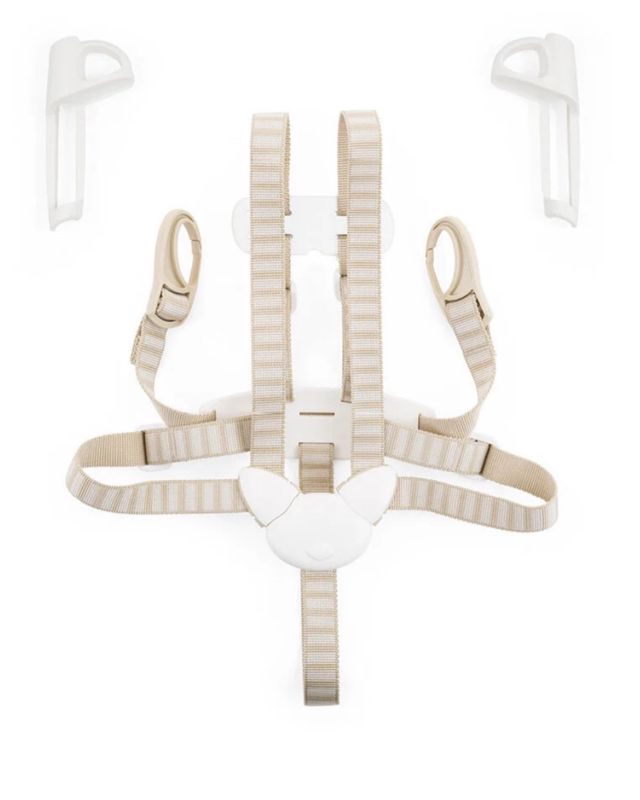 Detalles del productoArnés de seguridad para trona Stokke, con un diseño de rayas beige y blanco. Incluye los soportes para fijarlo a la trona.