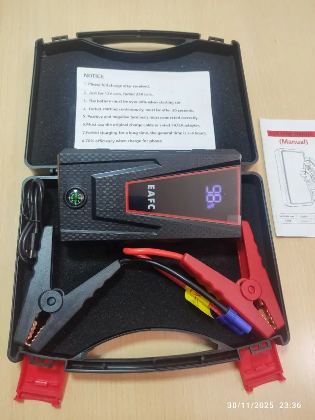 Detalles del productoEl dispositivo de la imagen es un arrancador de coche portátil de la marca EAFC. Es un dispositivo multifuncional que se utiliza para arrancar vehículos con baterías de 12V y también funciona como un banco de energía (power bank) y linterna LED.