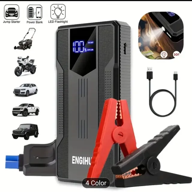 Arrancador de batería multifunción para vehículos. - Pantalla digital LED. - Incluye pinzas de arranque y cable USB. - Función de linterna LED y SOS.