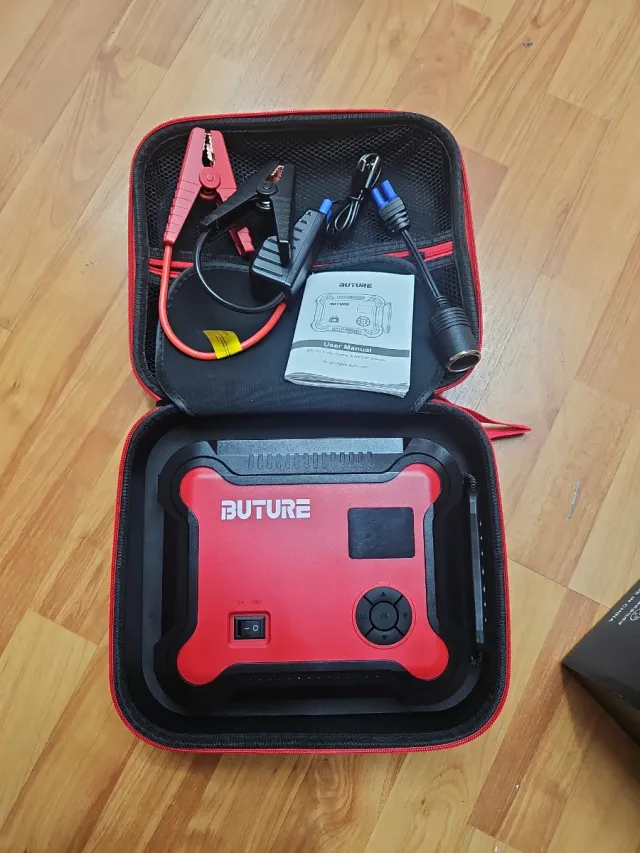 Arrancador de coche BUTURE con múltiples funciones, presentado en un estuche organizador. - Color rojo y negro. - Incluye cables de pinza y manual de usuario.