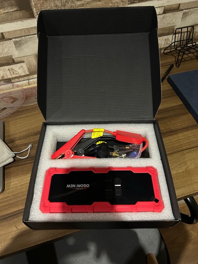 Arrancador de coche OGORI NEW B18 con 7000A de potencia. Incluye pinzas y cables. - Diseño robusto en color rojo y negro. - Compacto y fácil de almacenar.