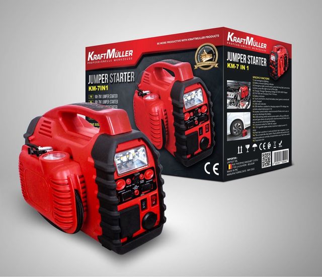 Detalles del productoarrancador de puente Kraftmuller KM-7IN1, su compañero de carretera compacto y versátil. Este dispositivo todo en uno ofrece iluminación de emergencia LED, una interfaz de carga USB dual, una toma universal de CA de 220 V y una toma de encendedor de cigarrillos de 12 V. Rápido de cargar y fácil de usar, es perfecto para arrancar automóviles de emergencia, alimentar dispositivos e iluminar su espacio de trabajo. Manténgase preparado para cualquier situación con esta solución de energía portátil.