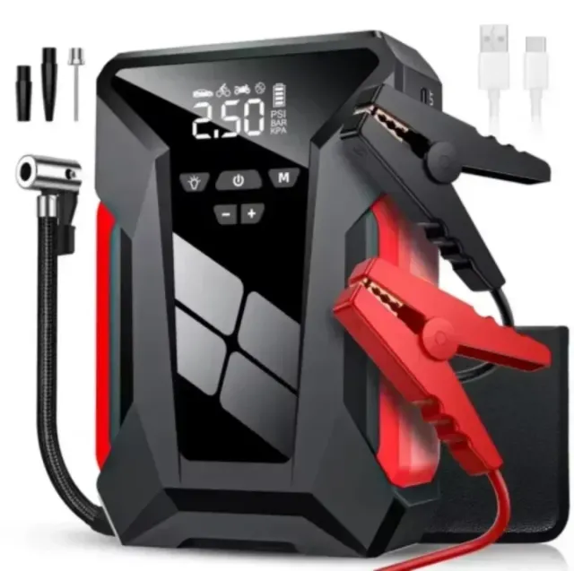 Detalles del productoArrancador de emergencia para baterías de coche, con diseño robusto y pantalla digital. Nuevo modelo Mejorado que incluye compresor de aire para neumáticos..