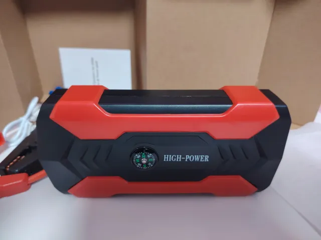 Detalles del productoArrancador de batería portátil con diseño robusto en color rojo y negro. Incluye una pequeña brújula integrada en la parte frontal.