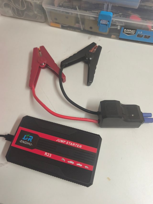 Arrancador de batería portátil para vehículos. - Modelo: R23. - Pinzas de conexión roja y negra. - Diseño compacto y moderno.