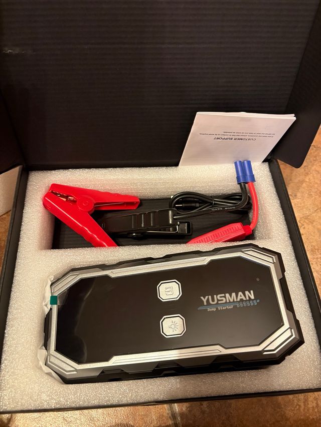 Arrancador de coche con pinzas rojas y negras. - Diseño moderno en color negro y plateado. - Incluye manual de instrucciones.