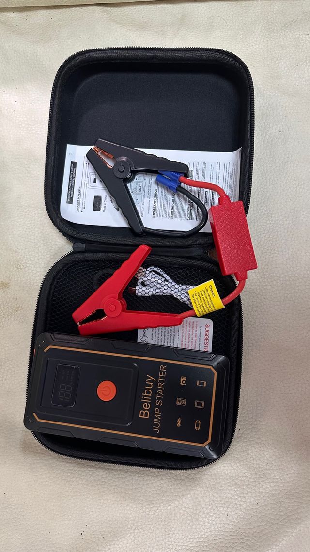 Detalles del productoArrancador de coche portátil de la marca Belibuy, ideal para emergencias.