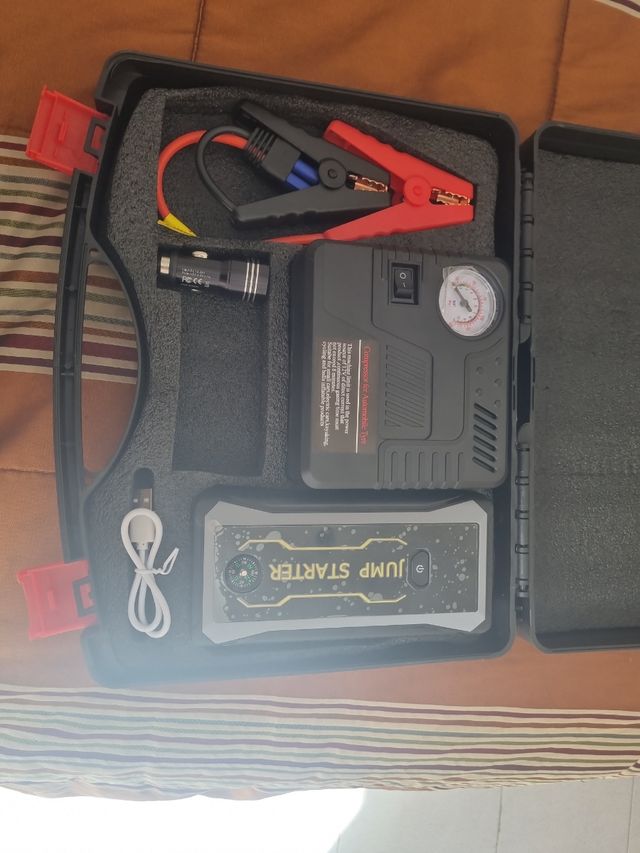 Detalles del productoKit de arranque y compresor de aire para neumáticos de coche.