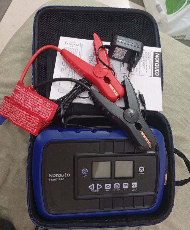 Arrancador de coche Norauto START PRO, ideal para emergencias. - Incluye pinzas de arranque (rojas y negras). - Cargador de pared. - Manual de instrucciones.