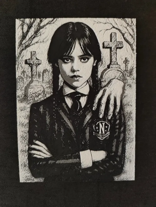 Detalles del productoEsta lámina de hueforge presenta a Miércoles Addams con su expresión seria y característica, vestida con el uniforme de la Academia Nunca más. Sus brazos están cruzados y "Cosa" (la mano sin cuerpo) descansa sobre su hombro, añadiendo el toque macabro que la distingue. El fondo muestra un cementerio con lápidas y árboles desnudos, todo en un estilo monocromático que realza su atmósfera gótica y misteriosa. Medidas 20x14,3cm.
