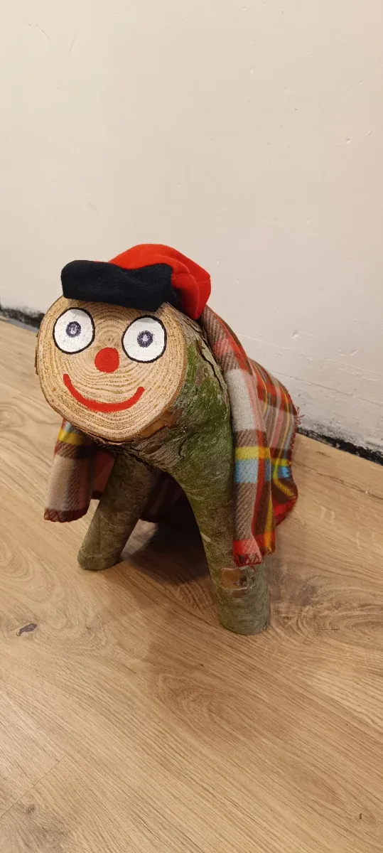 Figura de artesanía tradicional. - Hecho de tronco de madera. - Decorado con cara sonriente, ojos y nariz roja. - Lleva un gorro y una manta a cuadros.