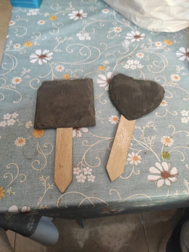 Hola vendo 2 picas para macetas o jardín con forma de corazón y cuadro son de pizarra y sobre unos 20cm de largo