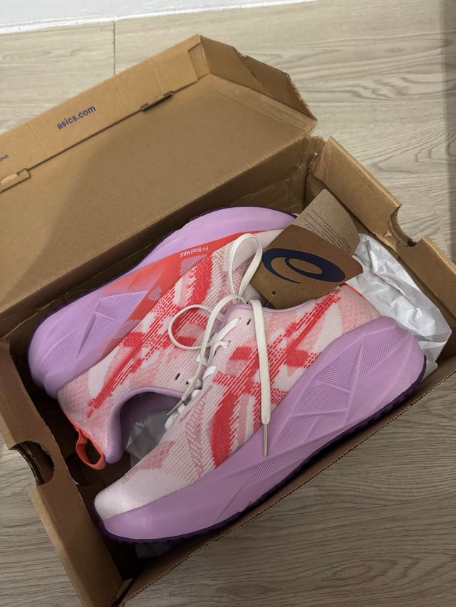 Zapatillas Asics Novablast 5 en tonos rosa y lila.