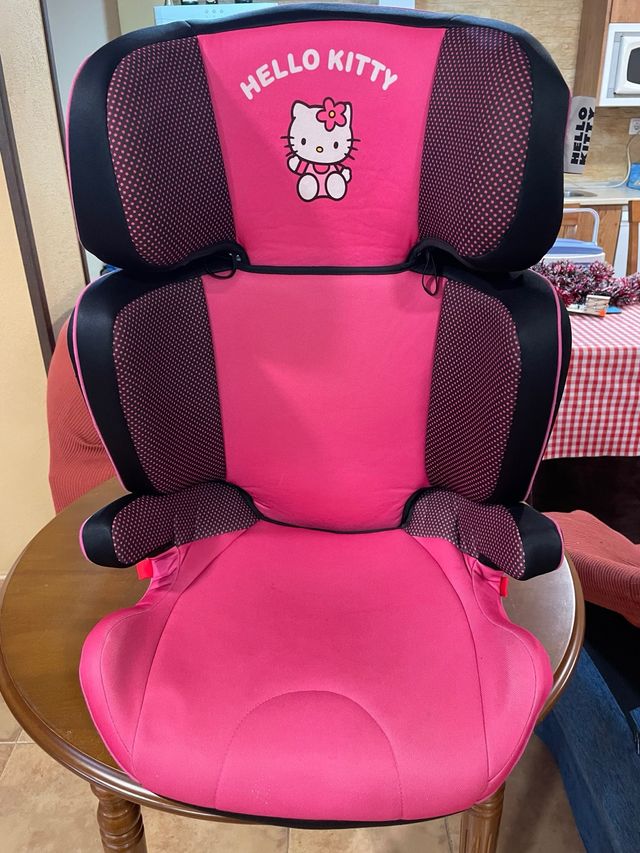 Detalles del productoAsiento de coche para niños, en color rosa y negro, con diseño de Hello Kitty. Está en buen estado.